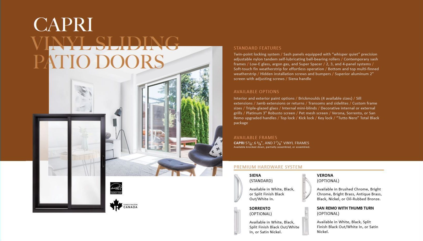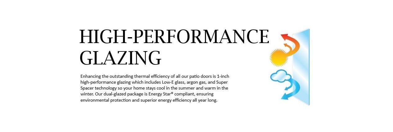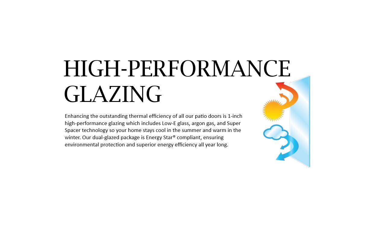 Enhancing the outstanding thermal efficiency of all our patio doors is 1-inch high-performance glazing which includes Low-E glass, argon gas, and Super Spacer technology so your home stays cool in the summer and warm in the winter. Our dual-glazed package is Energy Star® compliant, ensuring environmental protection and superior energy efficiency all year long.