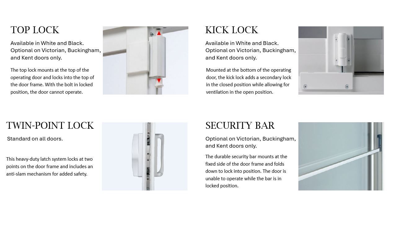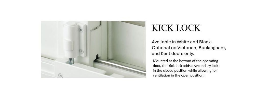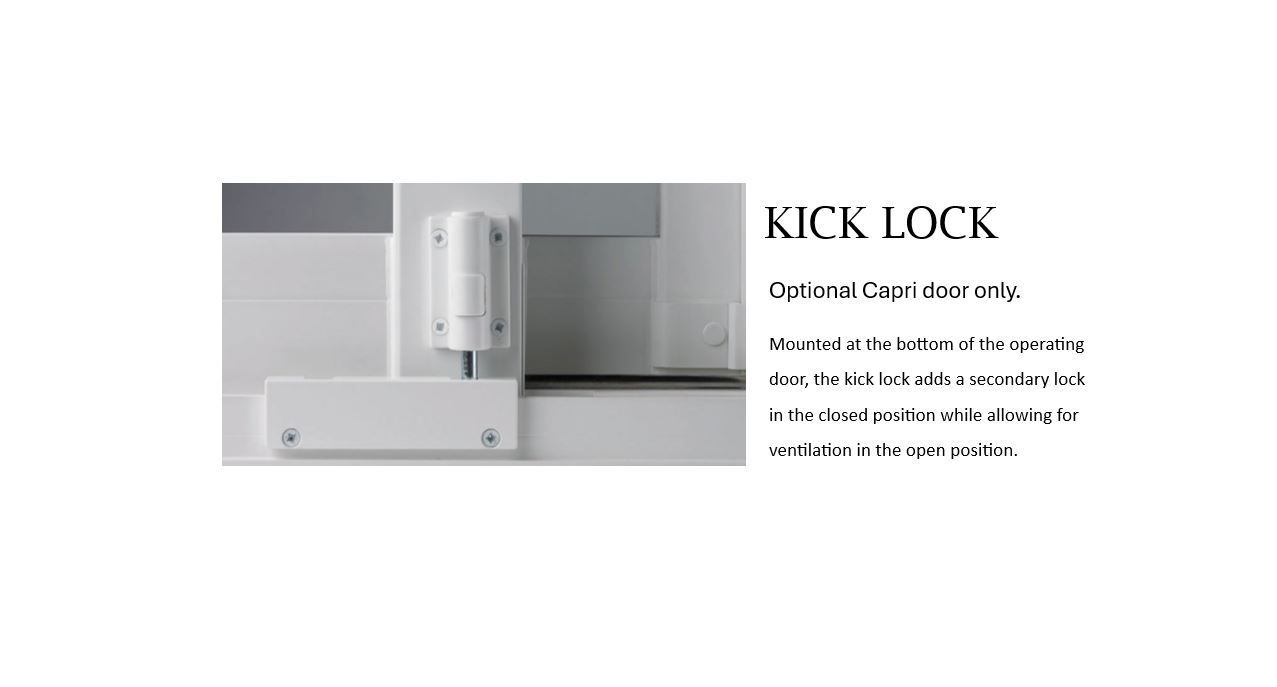 Kick Lock: Mounted at the bottom of the operating door, the kick lock adds a secondary lock in the closed position while allowing for ventilation in the open position.