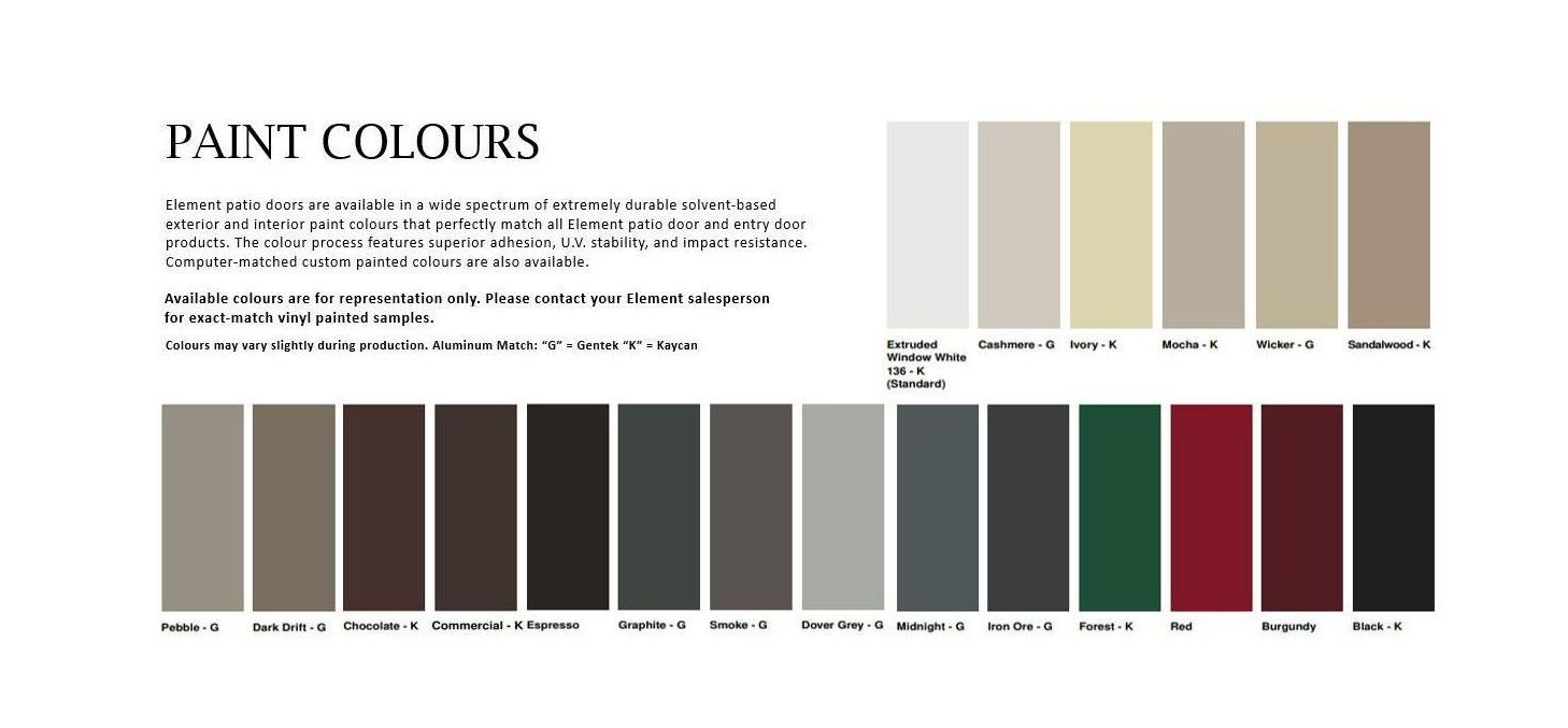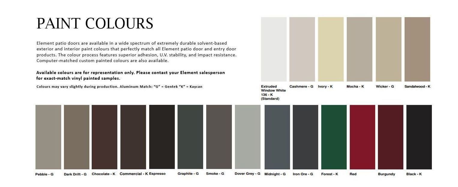 Element patio doors are available in a wide spectrum of extremely durable solvent-based exterior and interior paint colours that perfectly match all Element patio door and entry door products. The colour process features superior adhesion, U.V. stability, and impact resistance. Computer-matched custom painted colours are also available.