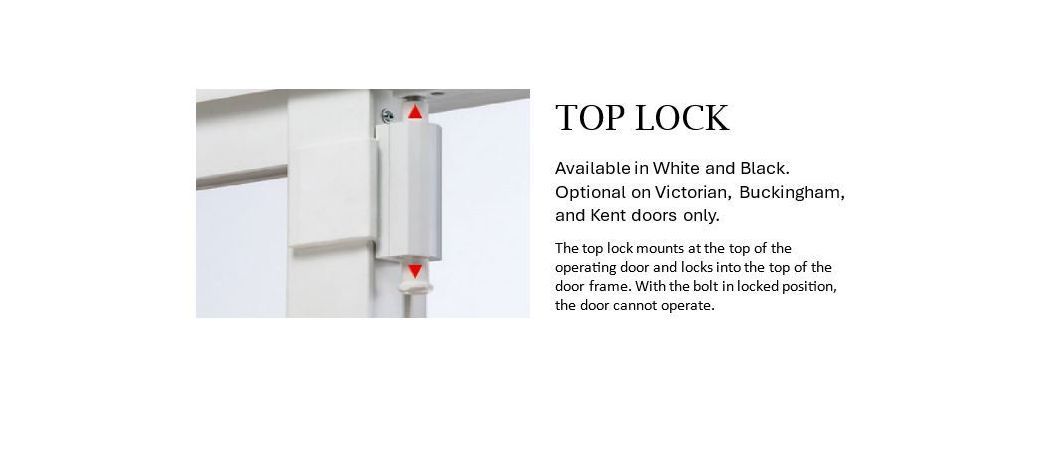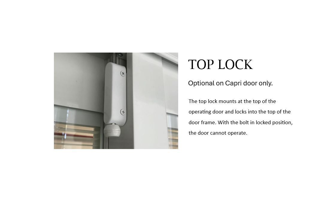 Top Lock: The top lock mounts at the top of the operating door and locks into the top of the door frame. With the bolt in locked position, the door cannot operate.