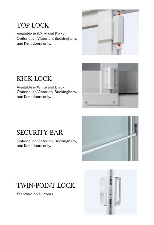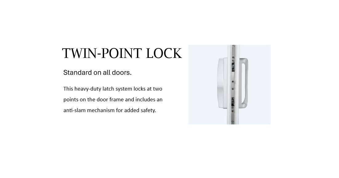 Twin-Point Lock: This heavy-duty latch system locks at two points on the door frame and includes an anti-slam mechanism for added safety.